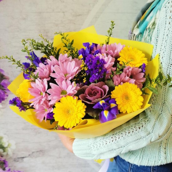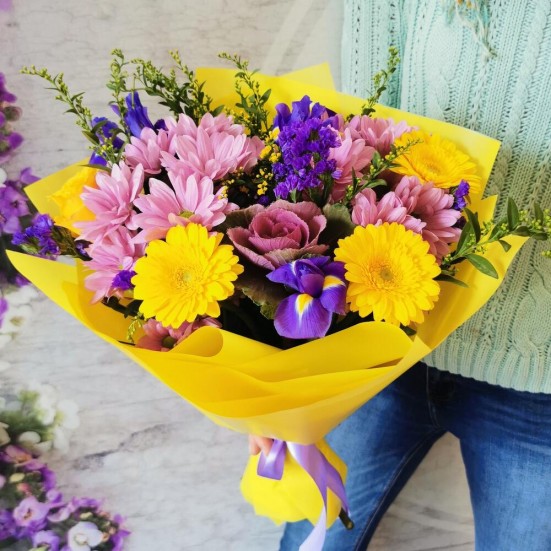 Букет с ирисами и хризантемами и герберами в Байкальске