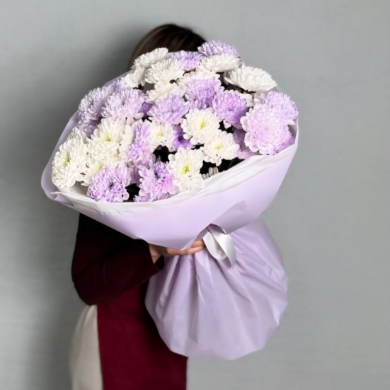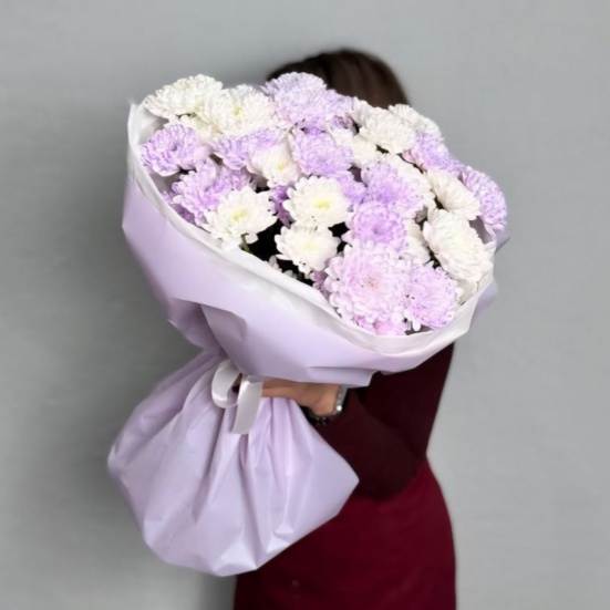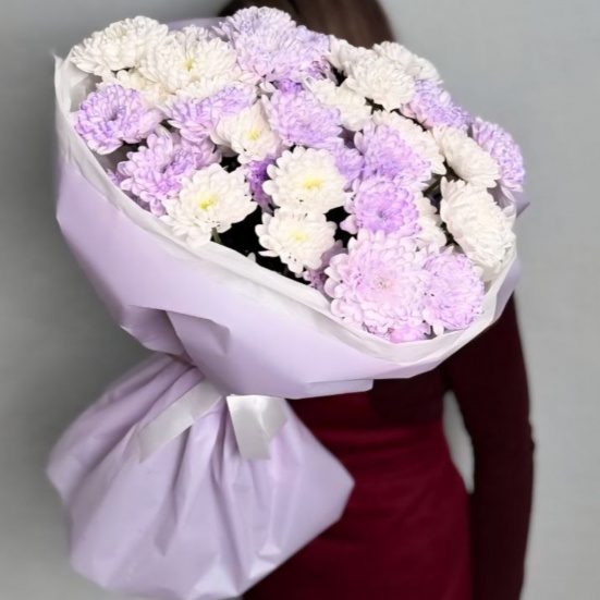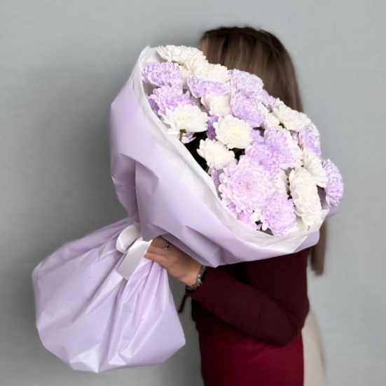 Букет из 9 фиолетовых и белых хризантем в Байкальске